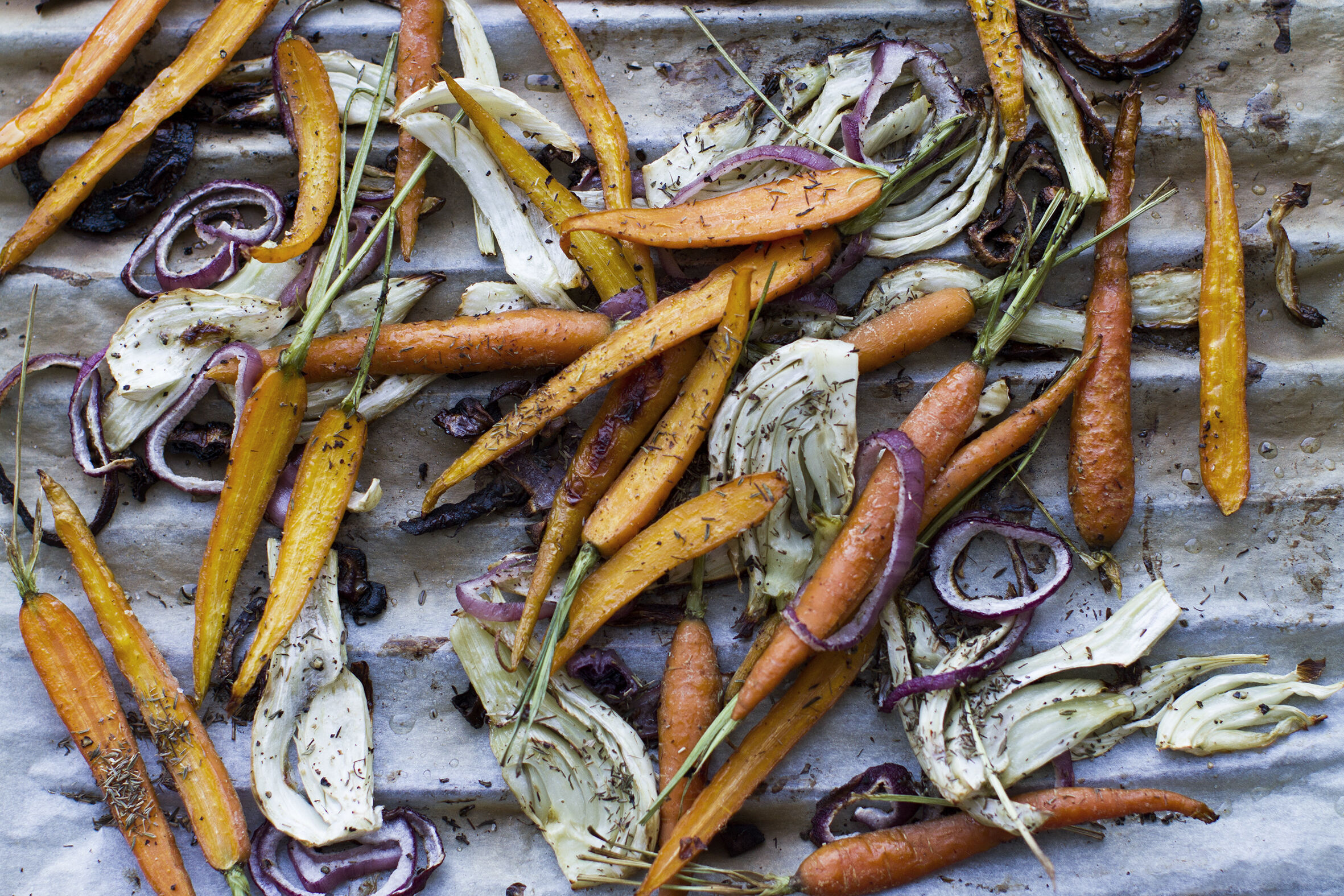 3. Mix the fennel, red onion and the baby carrots with 3 tbs of olive oil, salt and pepper and divide this over a baking sheet or roasting pan that is covered with baking paper. Bake for around 20-25 minutes until they start to colour and become al dente. Because all ovens are different, I advise you to check on them now and then. They have to keep their bite.