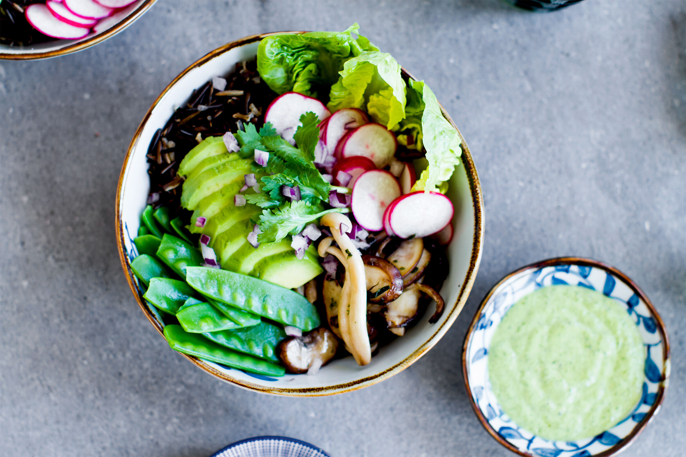6. Divide all the ingredients over the 4 bowls. Start with the rice, the lettuce leaves, the snow peas and the mushrooms. Then lay the avocado and radishes on top and sprinkle some diced red onion and coriander over it. Serve with the dressing on the side.